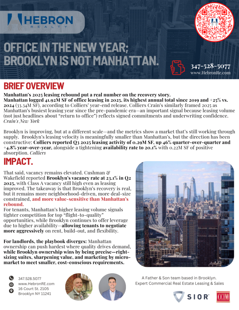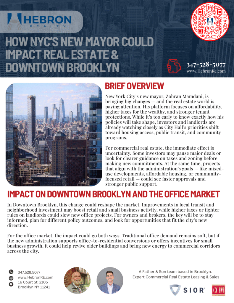 Read The Hebron Index The Hebron Index is a weekly whitepaper on NYC commercial real estate. Fast, unfiltered market insights from brokers on the ground—trends, deals, and what’s really moving. Search The 2025 Mid-Year Market Report June 23, 2025 No Comments Read More » Office in the New Year; Brooklyn is NOT Manhattan January 8, 2026 No Comments Read More » NYC’s New Mayor January 8, 2026 No Comments Read More » Trump’s Big Beautiful Bill August 6, 2025 No Comments Read More » Shift Share Analysis – Kings County July 17, 2025 No Comments Read More » 467-M Tax Incentive July 10, 2025 No Comments Read More » NYC Office Distress: Why LLs need to sign leases, now. July 10, 2025 No Comments Read More » Read our market reports Search Montague Corridor Retail Gap Analysis Q2 2025 May 12, 2025 No Comments Read More » Manhattan Office Report – Q1 2025 May 12, 2025 No Comments Read More » Downtown Brooklyn Office Market Overview – Q2 2025 April 24, 2025 No Comments Read More » WFH Trends – 2024 Brooklyn Office SOTM March 25, 2025 No Comments Read More » Q4 2024 Brooklyn Retail Report March 25, 2025 No Comments Read More » 2024 Brooklyn Office Market SOTM March 11, 2025 No Comments Read More » Hebron Realty YouTube